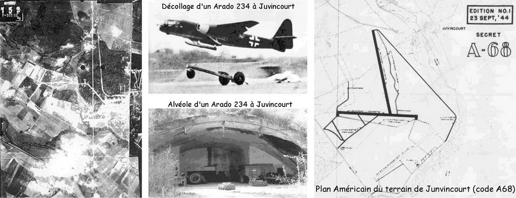 Malgré ces nombreux bombardements , de drôles d'oiseaux vont évoluer depuis le terrain de Juvincourt : les Arado 234 et les Messerschmitt 262 à réaction!!!!